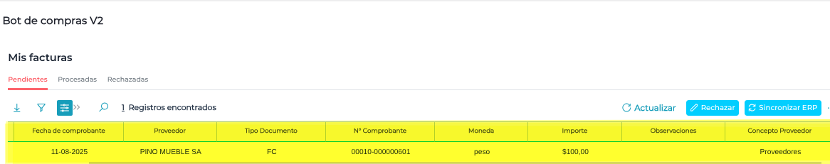 En la sección “Mis Facturas” del Bot de Compras, en las diferentes solapas se muestran distintos campos con información relevante de los proveedores, sobre los cuales es posible aplicar filtros para facilitar la búsqueda según determinados criterios.