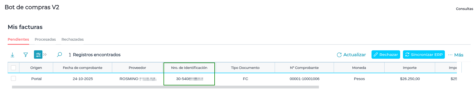 Al ingresar al Bot de Compras > Mis Facturas > Pendientes, se visualiza que el número de identificación tributaria corresponde al configurado en el Maestro de Proveedores: