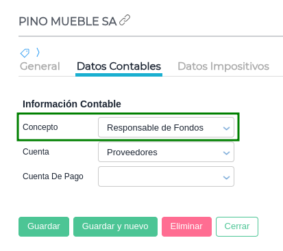 Como se visualiza en el Maestro, el Proveedor “PINO MUEBLE SA” tiene el concepto “Responsable de Fondos”: