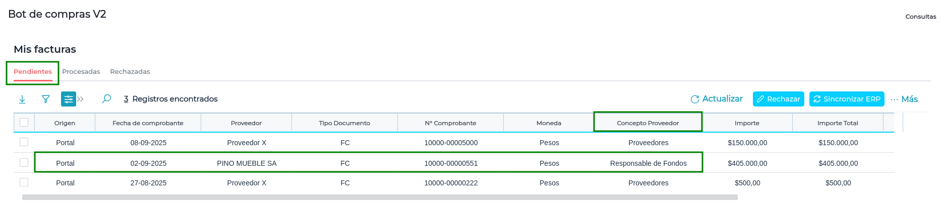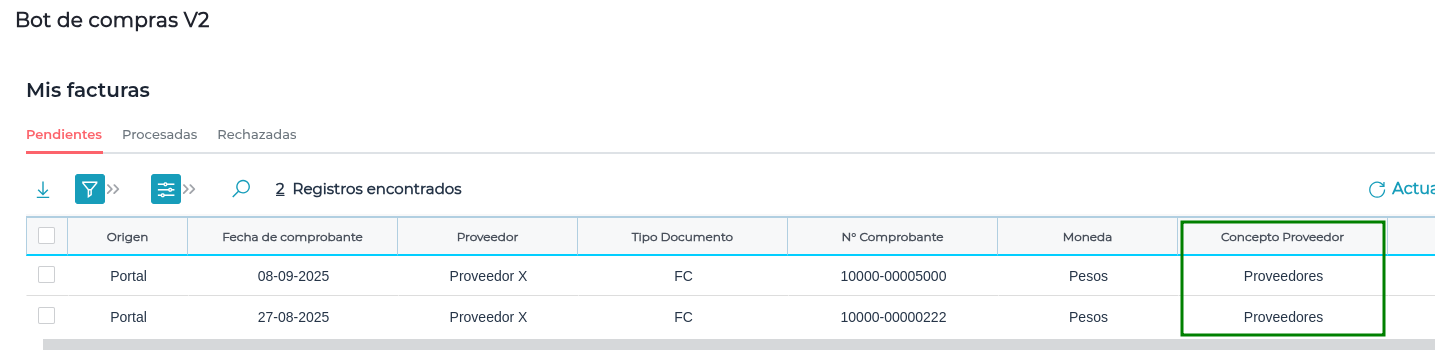 Al ingresar al Bot de Compras > Mis Facturas > Pendientes, se visualiza que el concepto corresponde al configurado: