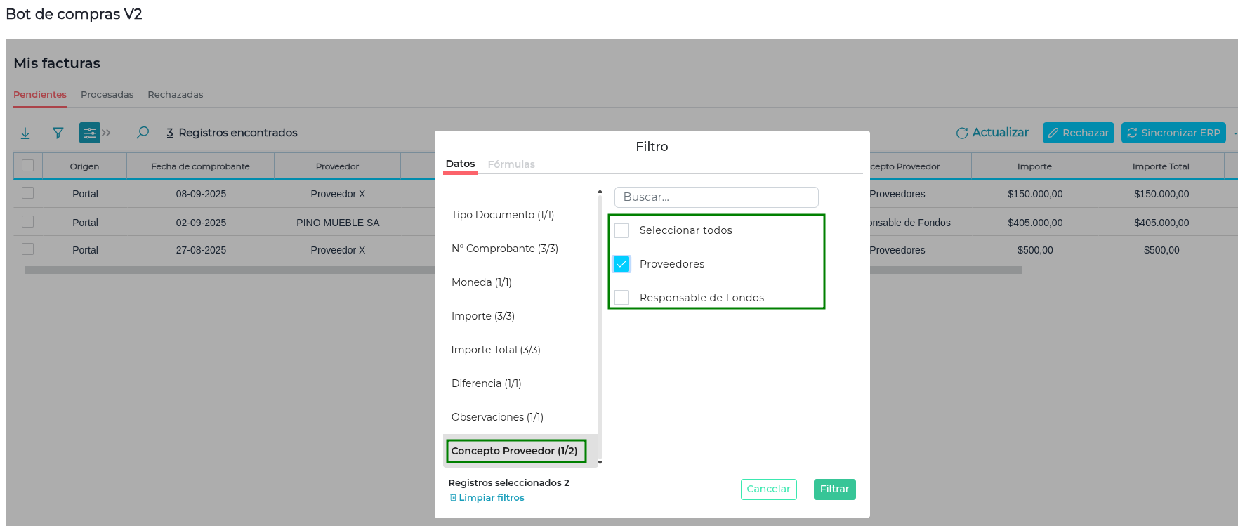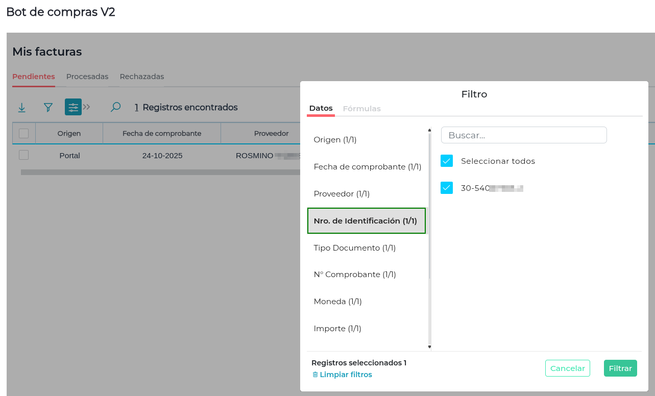 En la sección “Mis Facturas” del Bot de Compras, en las diferentes solapas se muestran distintos campos con información relevante de los proveedores, sobre los cuales es posible aplicar filtros para facilitar la búsqueda según determinados criterios.