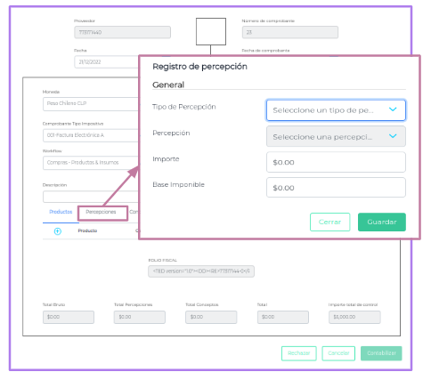Para registrar una percepción se deberá completar los campos necesarios. Haciendo clic en el signo + se abrirá un pop-up solicitando la siguiente información: