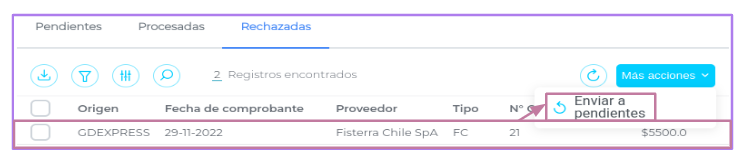 - Enviar una factura rechazada a la pestaña Pendientes, haciendo clic en el checkbox del registro » Más acciones » Enviar a pendientes.