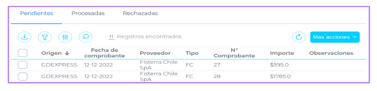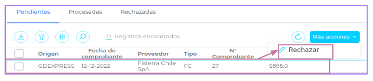 Se podrá rechazar una factura haciendo clic en el checkbox del registro » Más acciones » Rechazar.