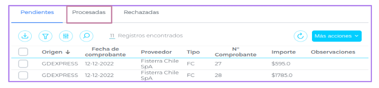 En esta pestaña se podrá visualizar todos los documentos enviados y procesados correctamente en el sistema de gestión ERP.