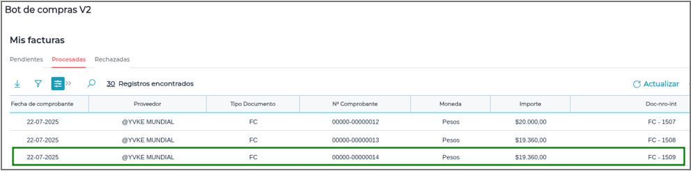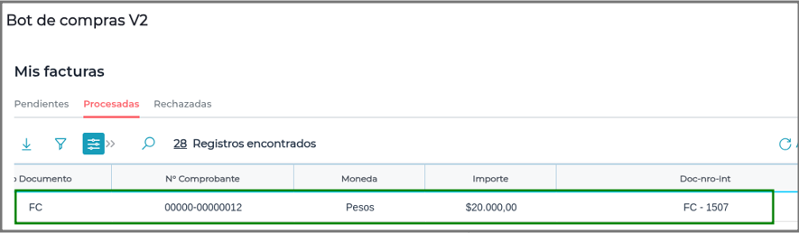 La misma se puede ver también en el ERP. Ir a Menú > Gestión Empresarial > Compras > Transacciones > Facturas: