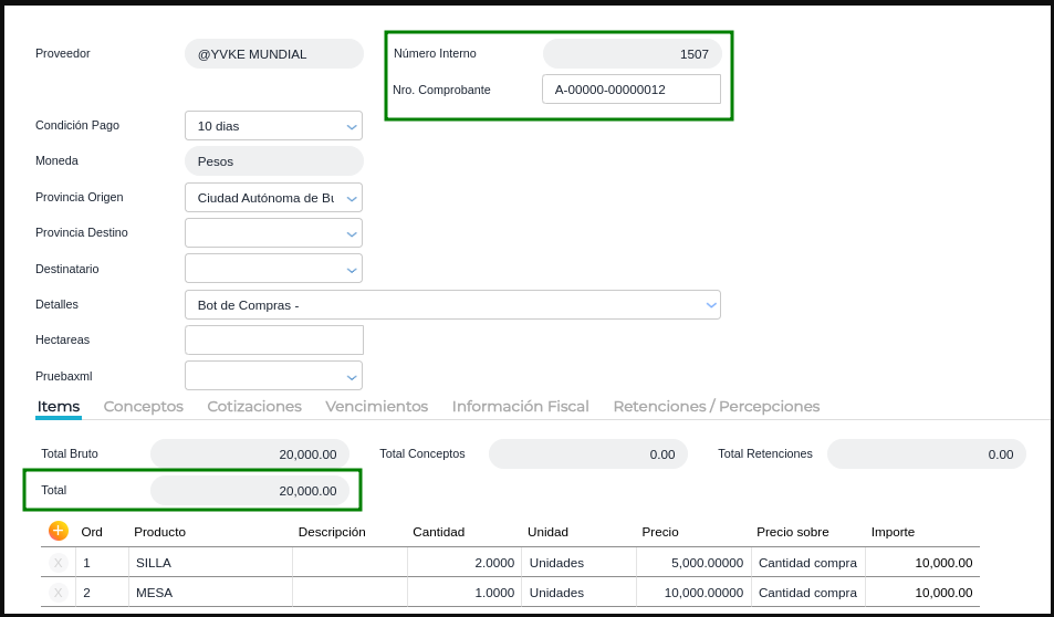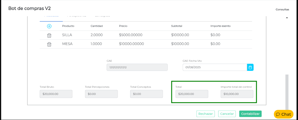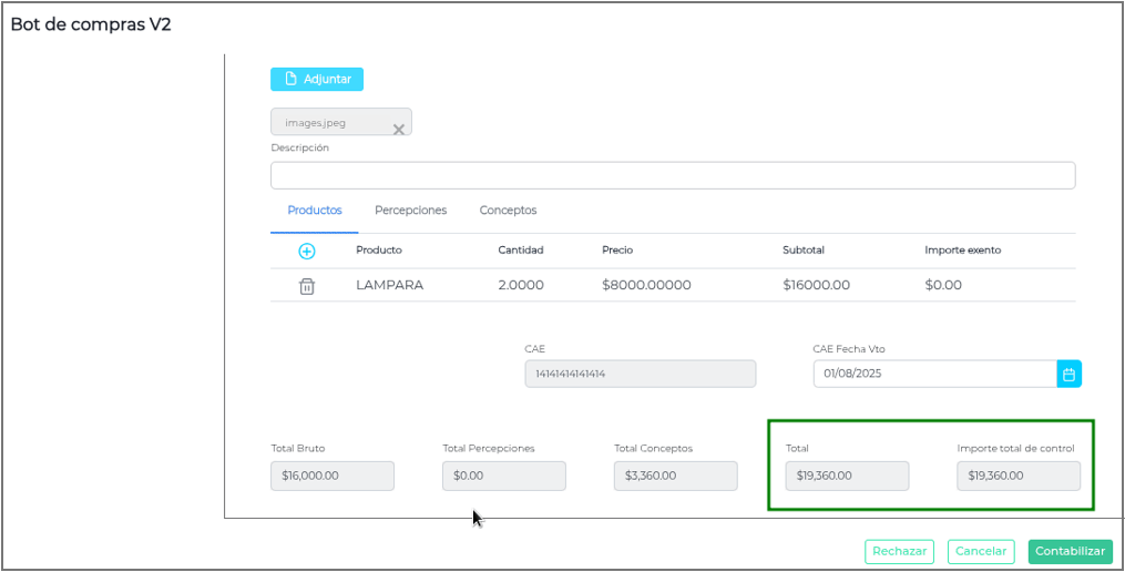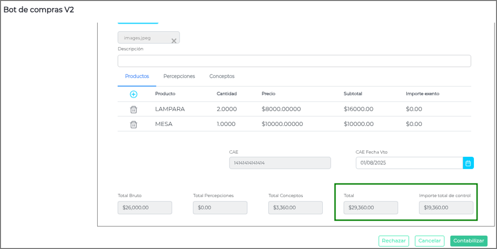 En la gestión de Facturas de Compra a través del Bot de Compras, es importante asegurar la coherencia entre el importe “Total” registrado en el documento y el campo “Importe total de control”.