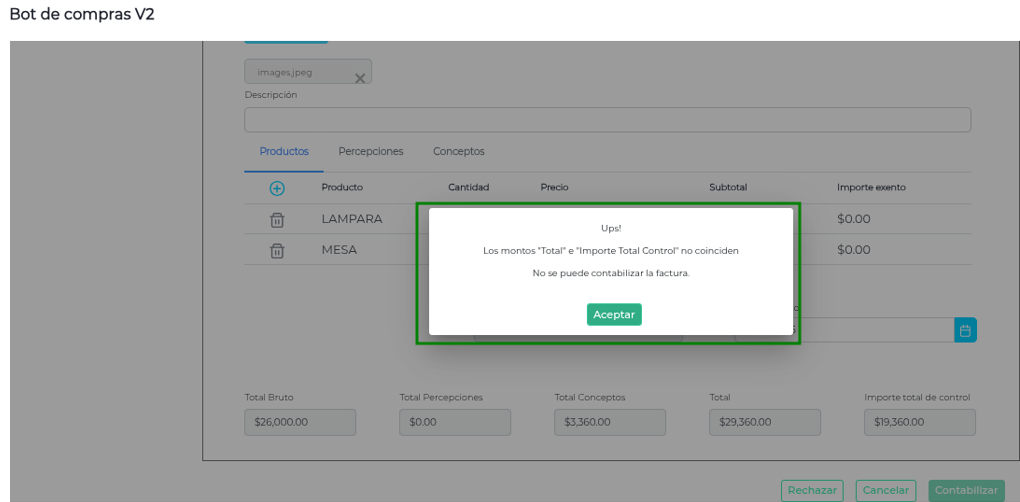 Se intenta contabilizar una Factura de Compra, en la cual el importe “Total” y el “Importe total de control” no coinciden, en este caso, al tener la casilla de “Controlar total importes” habilitada, el Bot de Compras no permite contabilizarla e informa el error con un mensaje en una ventana emergente.