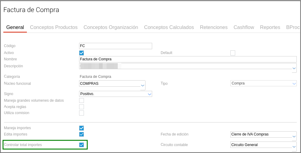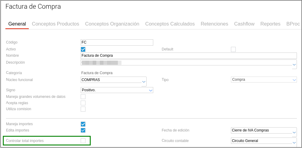 - Deshabilitar casilla “Controlar total importes”: