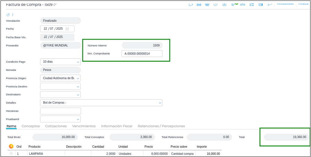 Ir al Bot de Compras, como se observa, la Factura de Compra se contabiliza: