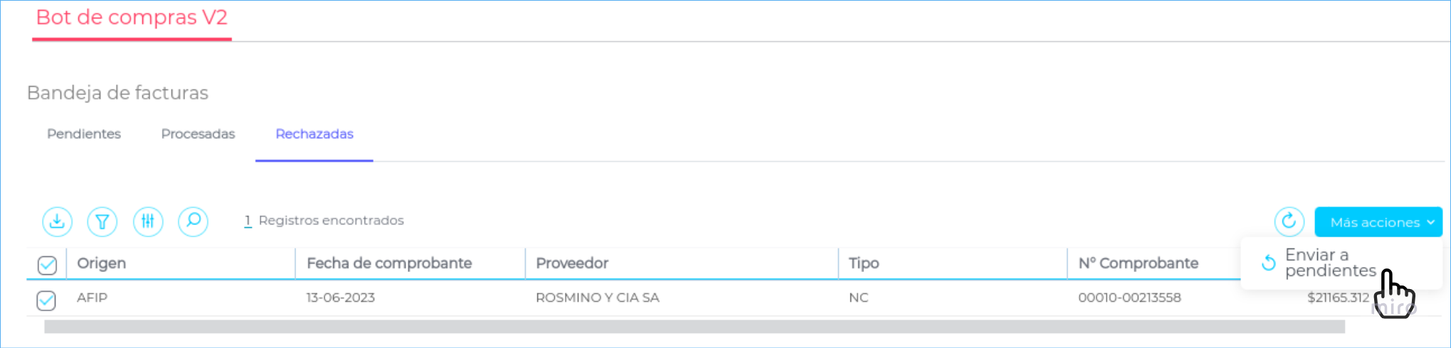 Aclaración: la funcionalidad de “Rechazar” es meramente para mover las facturas de la bandeja de “pendientes” a la de Rechazadas", pero NO tiene impacto en AFIP.