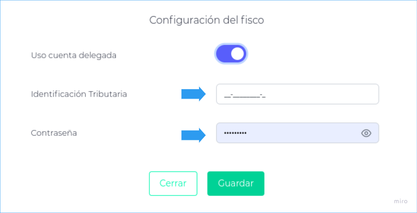 Para esto se deberá configurar la “indentificación tributaria” y “contraseña” del CUIT correspondiente a la Empresa:
