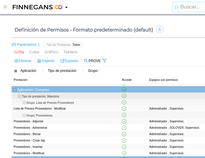 Ingresar a Definición de permisos > Aplicación: Compras > Tipo de prestación: Maestros > Proveedores: Insertar. Hacer click en el mismo para definir los “Equipos” que tendrán acceso para la creación de proveedores.