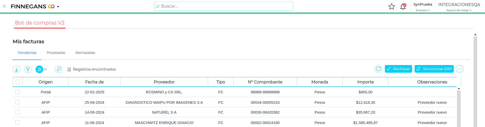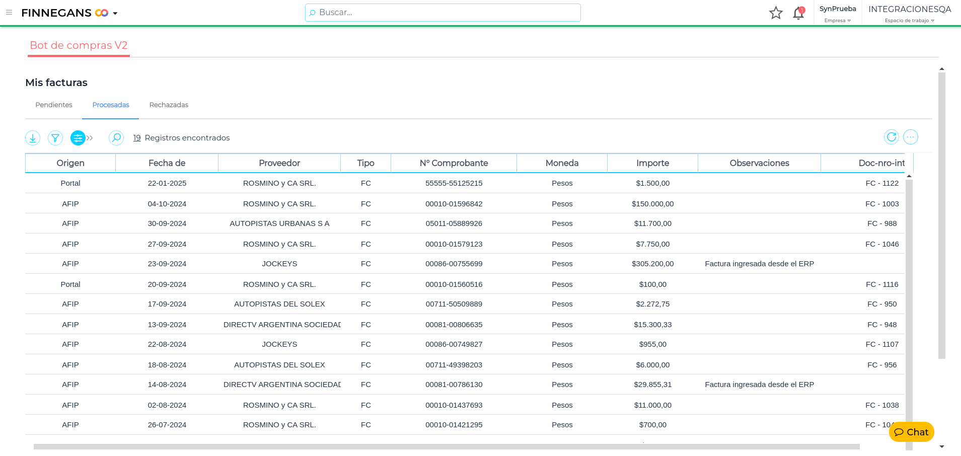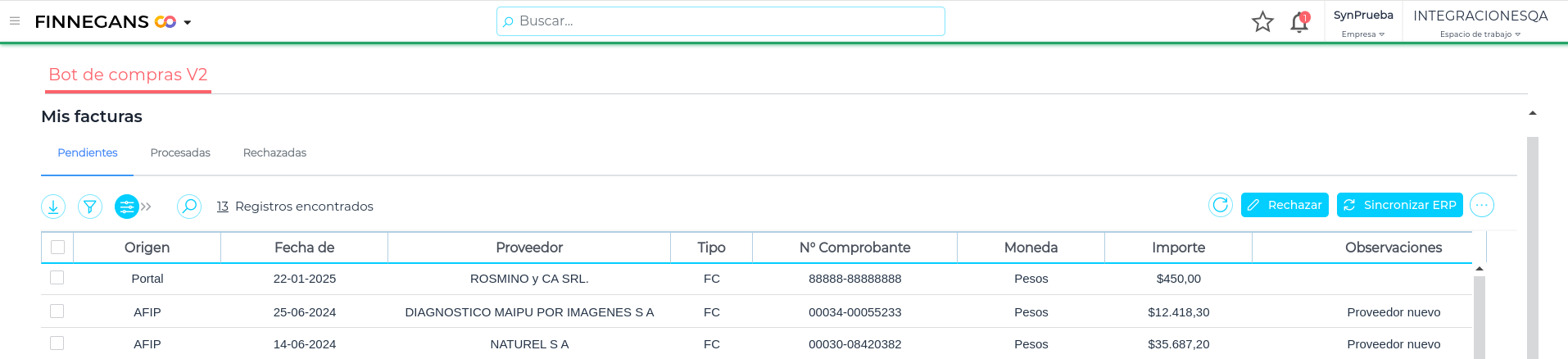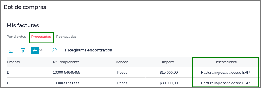 - Si la factura de compra existe, la marca como procesada y la misma pasa a la solapa de “Procesadas”, donde en la columna “Observaciones” se visualiza “Factura ingresada desde el ERP”.