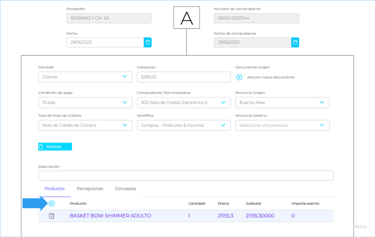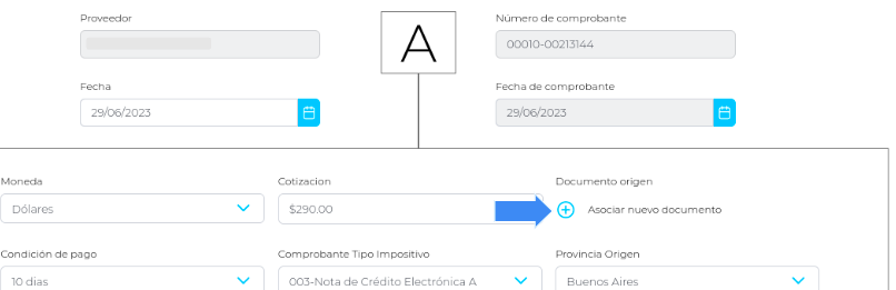 - a) Con asistente: asociando un documento ya generado desde el botón + como muestra la imagen. Desde una nueva pantalla podrá seleccionar los documentos relacionados desde donde se cargarán los productos.