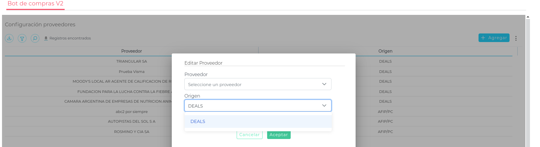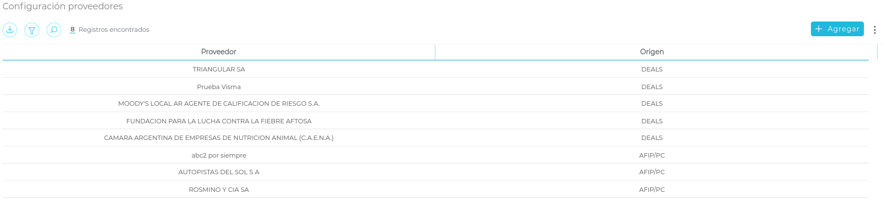 Si además de AFIP, existe la posibilidad de recibir comprobantes desde DEALS para determiandos proveedores, en esta sección deberán asignar para el/los proveedores correspondientes el origen DEALS. De esta manera, para esos proveedores el origen de las facturas va a ser DEALS y no AFIP.