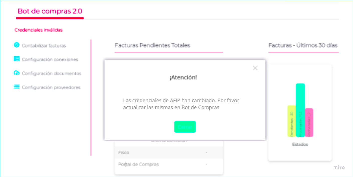 En el caso que las credenciales hayan cambiado y no se hayan actualizado en la aplicación, recibirá un mensaje de advertencia, recordando el cambio en la configuración de conexiones.