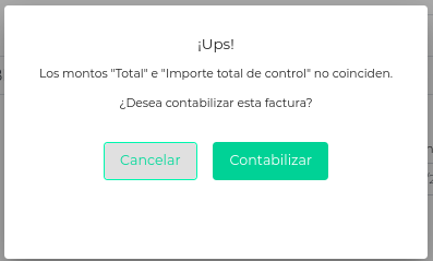 Para contabilizar presionar el botón CONTABILIZAR, si los campos “Total” e “Importe Total de Control” son distintos, se emitirá un mensaje de advertencia para informar al usuario. El sistema permitirá contabilizar la factura en ERP. El Total que registrará será el ingresado por el usuario.