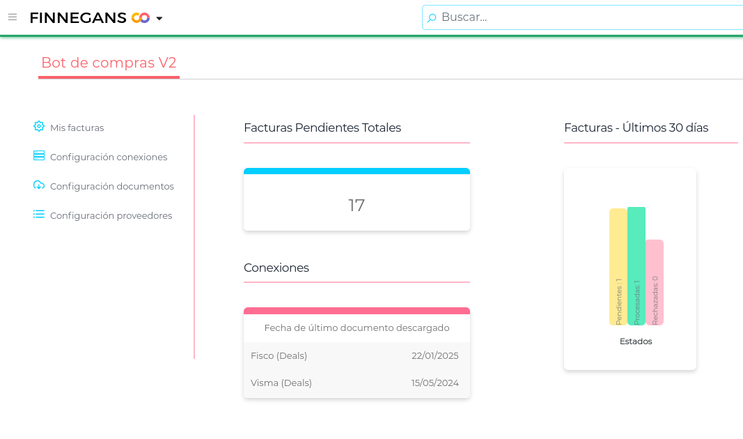 - Conexiones: para cada orígen configurado, muestra la fecha de la última vez que encontró facturas para descargar.