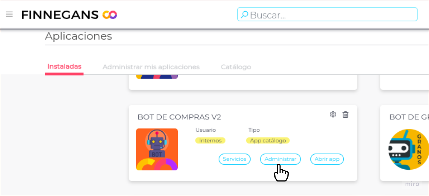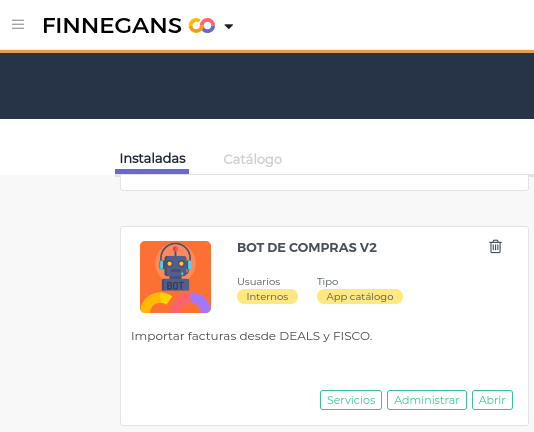 Desde Menú izquierdo → Administrar → Plug&Go → Instaladas → Bot de Compras, hacer click en Abrir para acceder a la aplicación.