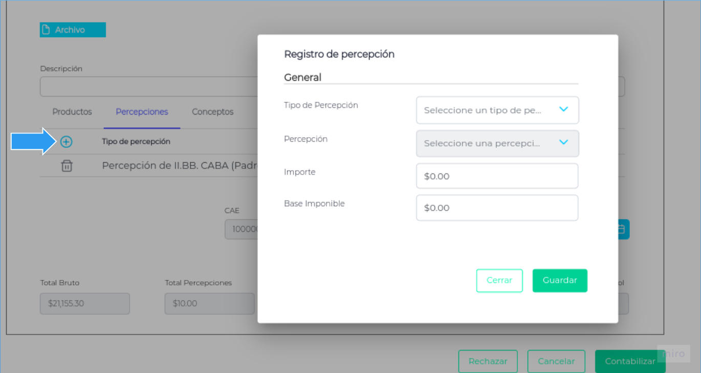 En el documento también se podrán registrar percepciones en la solapa con ese nombre. Presionando sobre el botón + como se muestra en la imagen: