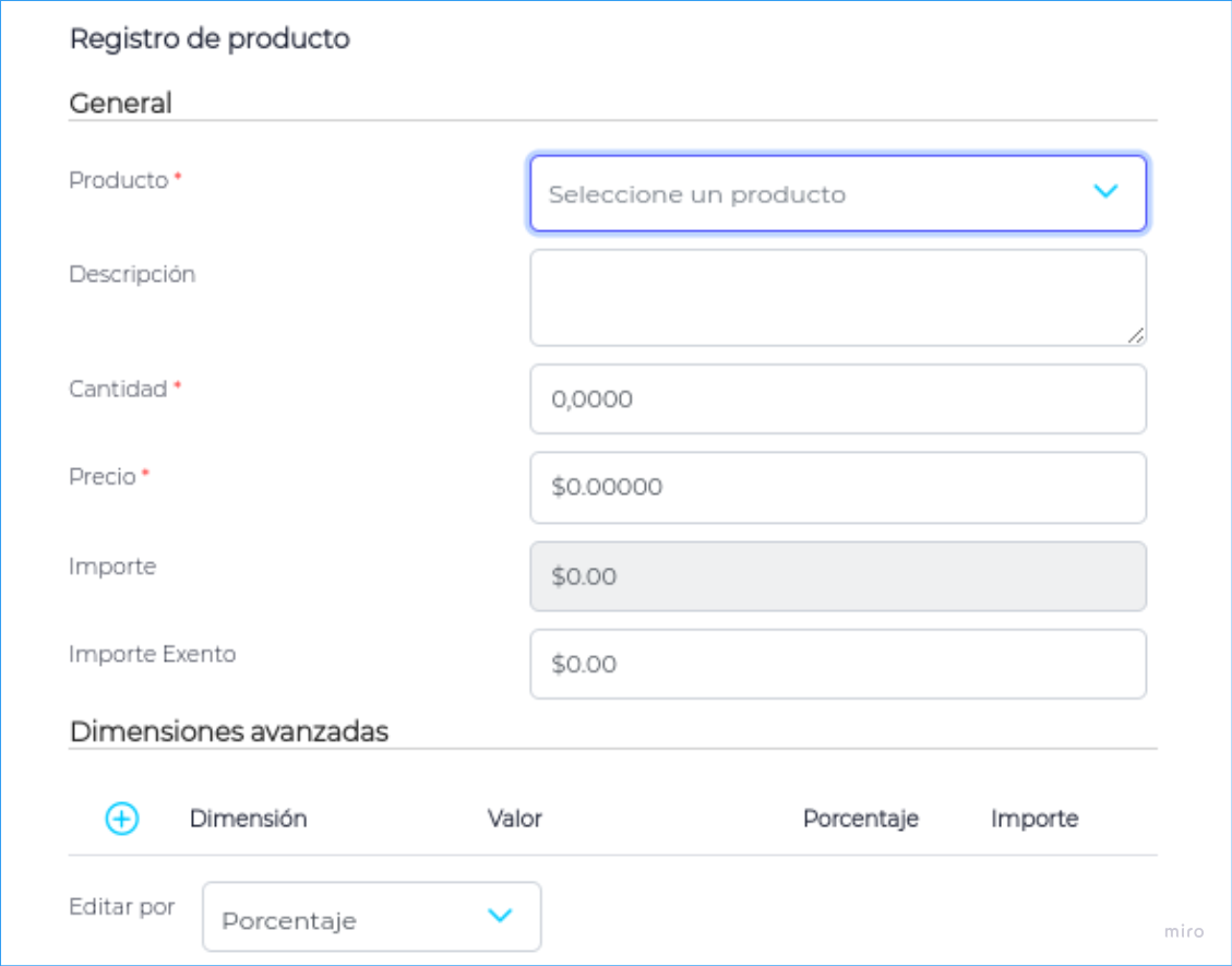 Al presionar el botón, se abrirá una nueva pantalla donde podrás seleccionar los productos, y registrar cantidad y precio. Además podrás definir Dimensión, valor y porcentaje del mismo.