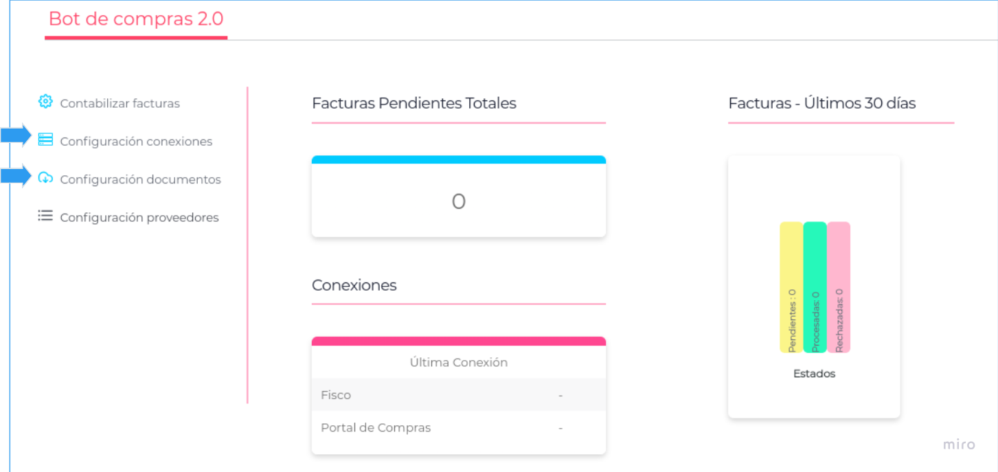 - A la izquierda de la pantalla los accesos a configuraciones y el enlace para contabilizar documentos