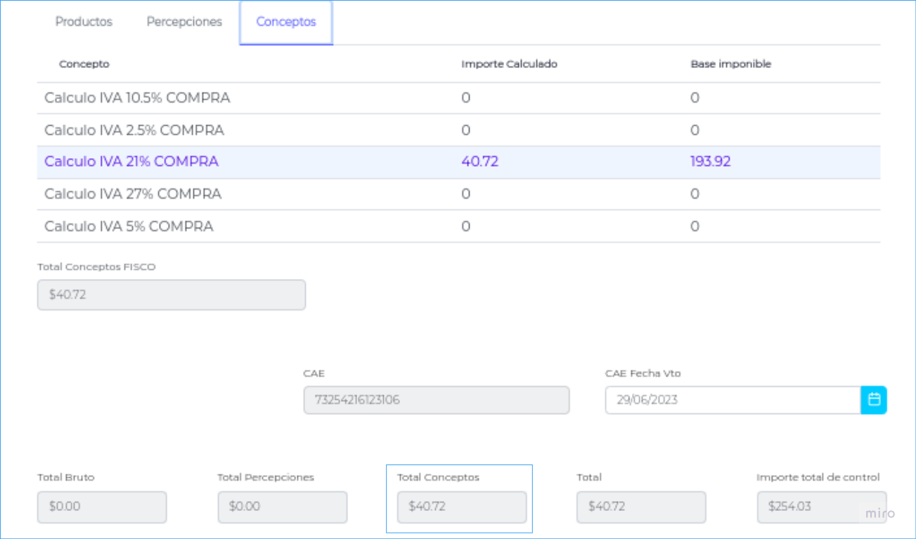 En los casos en los que los documentos descargados incluyan importes de “Conceptos”, el importe se visualizará en el Campo “Total Conceptos” y no podrá editarse.