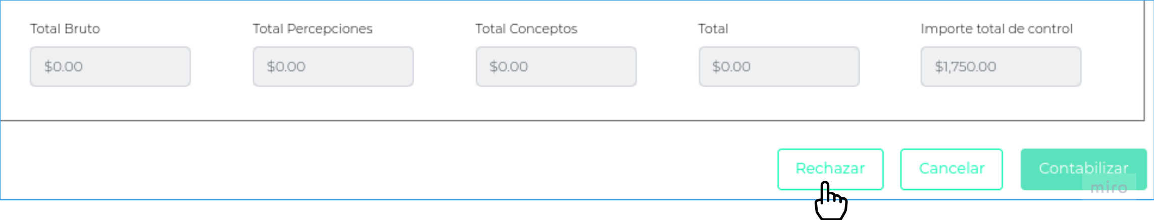 Si por algún motivo decide no contabilizar el documento, lo podrá “Rechazar”, y el mismo pasará de la bandeja “Pendientes” a “Rechazadas”.