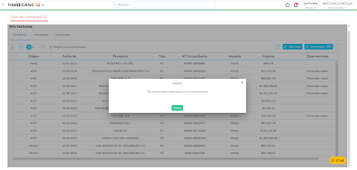 En caso de que el usuario que está operando el Bot de Compras, no posea permisos para creación de proveedores, al abrir una factura saldrá un cartel informativo y le impedirá contabilizar la misma.