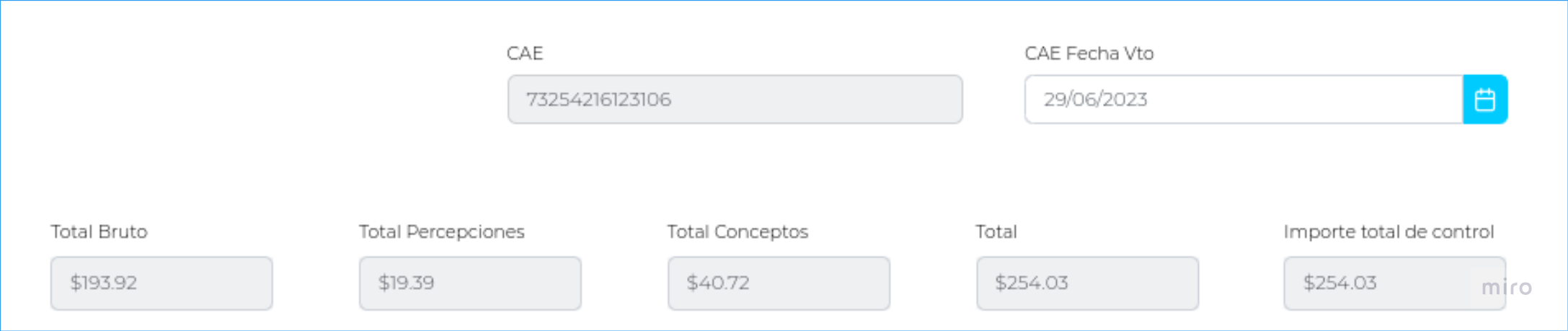 Una vez completada la información de productos, percepciones y conceptos, el sistema calculará los Importes Totales (Bruto, Percepciones, Conceptos) y completará el campo “Total” con la suma de los tres anteriores.