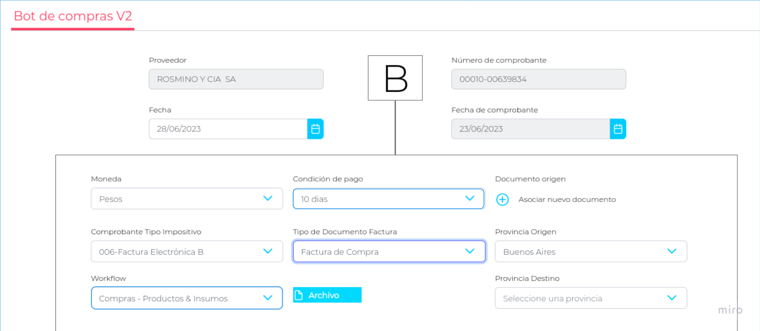 - Bot de Compras valida la existencia de las facturas de compras, respetando el formato de número de comprobante de AFIP, compuesto por: Código de Tipo de Comprobante (1 letra) + Punto de venta (5 dígitos) + Número de Comprobante (8 dígitos) → Ejemplo: A-00001-00001234.