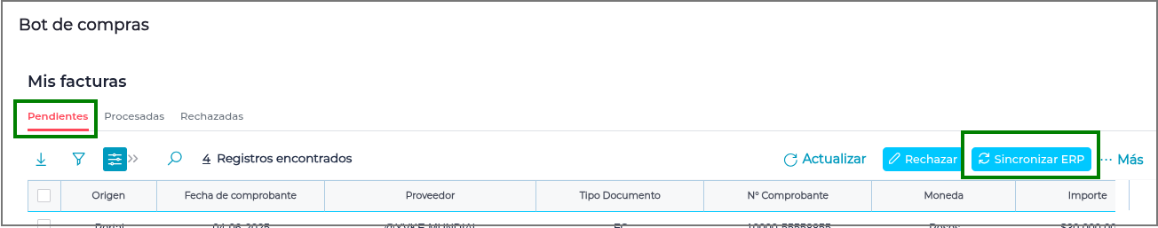 Si una factura fue contabilizada desde ERP y aún no se ve reflejado en la bandeja de Pendientes, podrás hacer click en “Sincronizar ERP”, para mover la factura en cuestión a la solapa Procesadas.