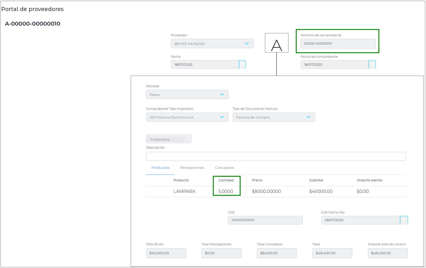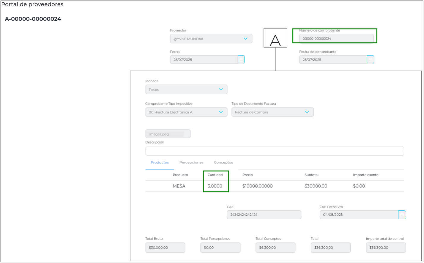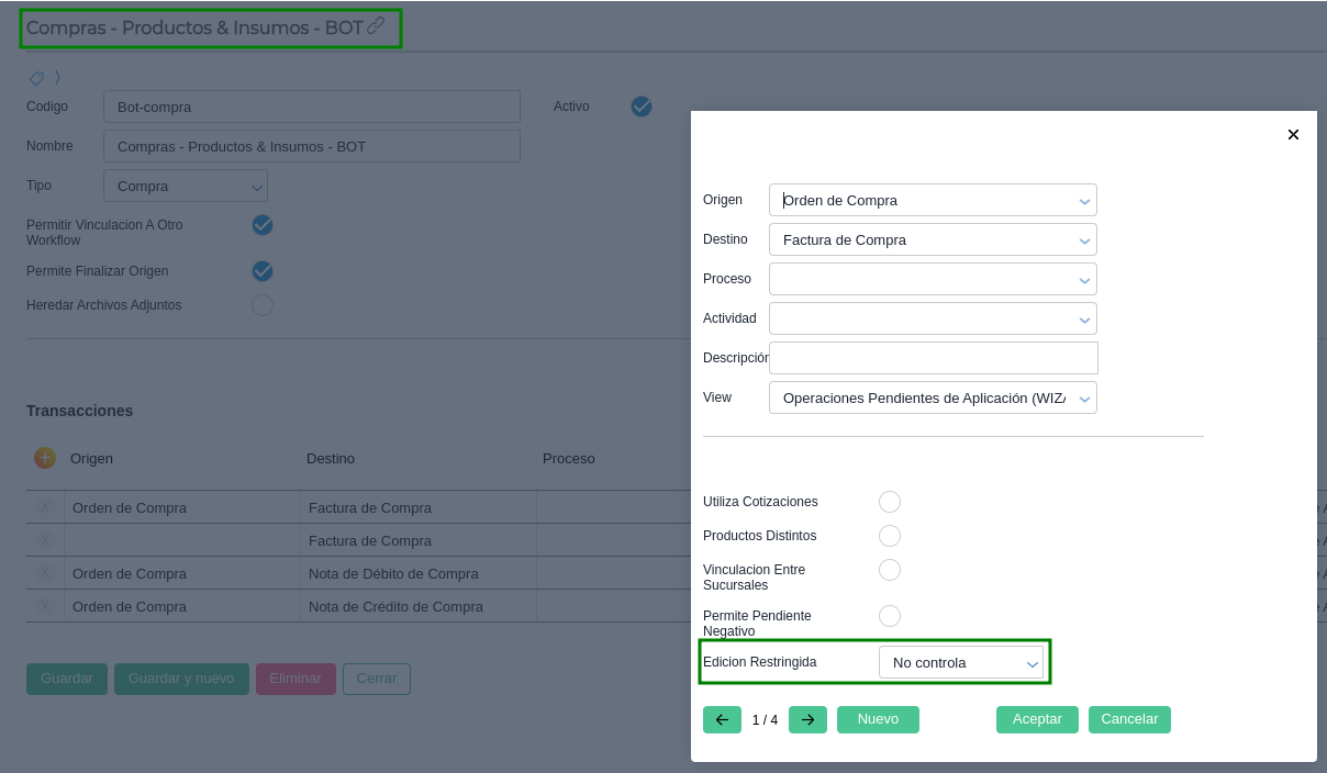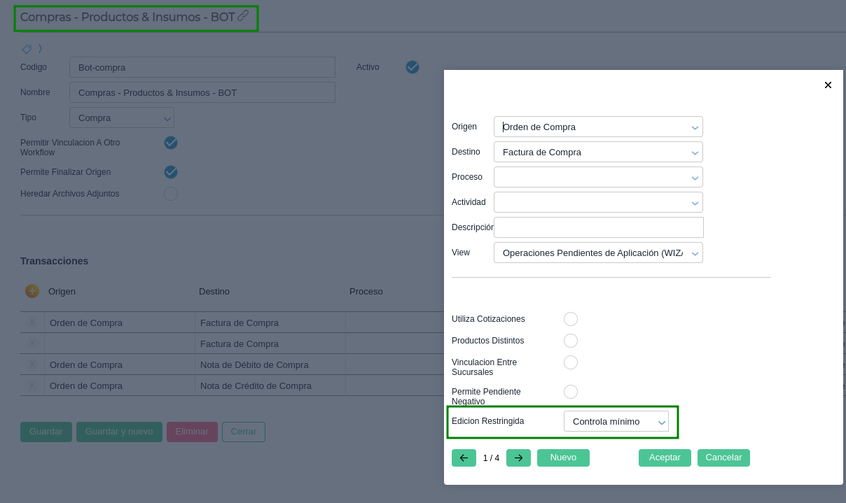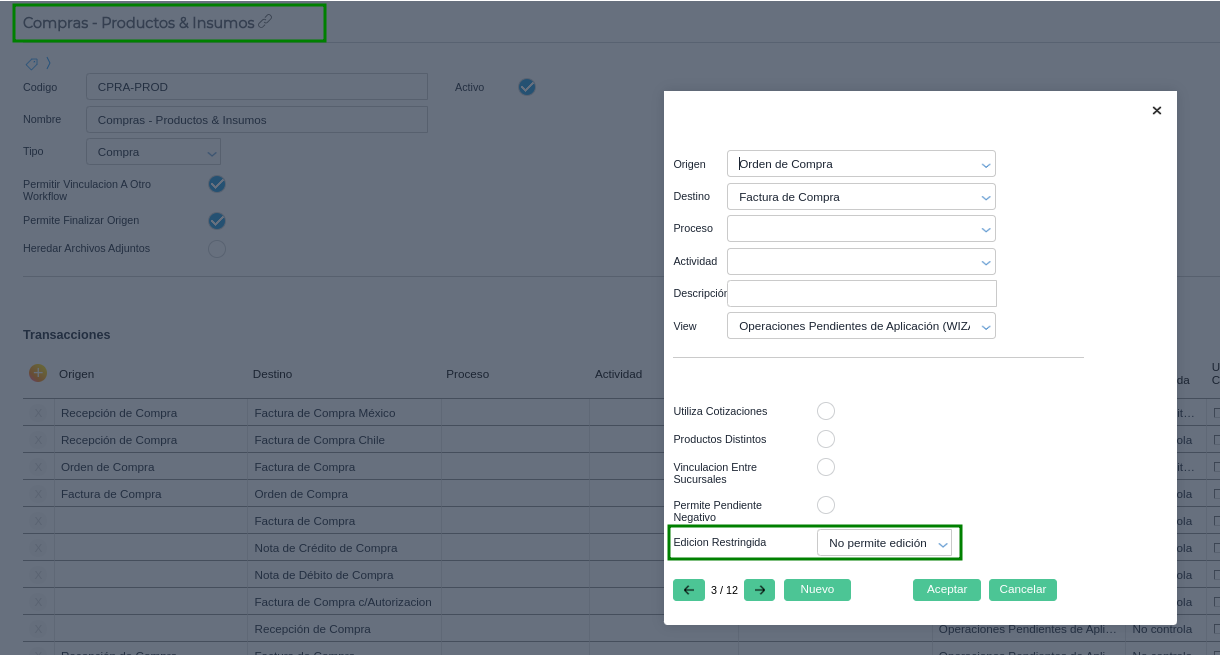 - Factura de Compra con campo origen Portal de Proveedores y el Workflow con “Edición Restringida = No controla” y agregando un nuevo ítem.