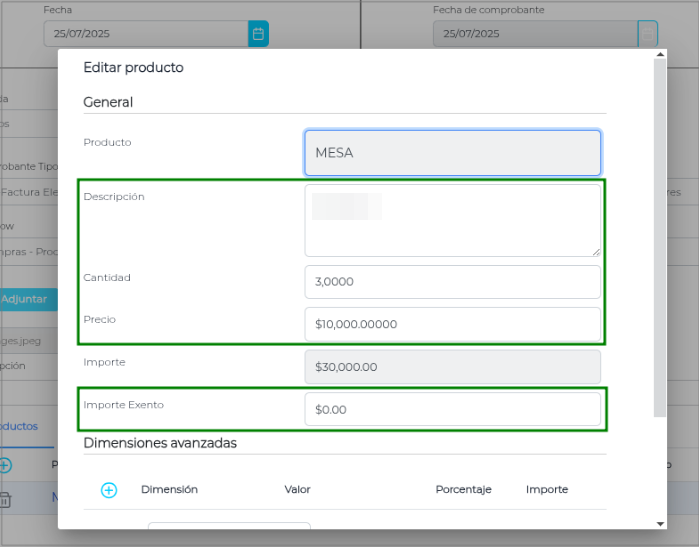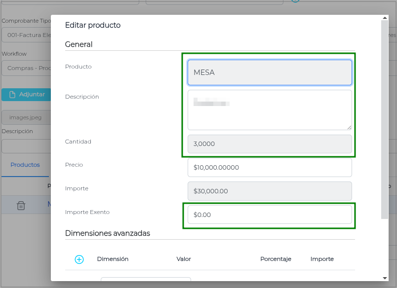 Por otro lado, sin importar la configuración del Workflow, los campos “Descripción” e “Importe Exento” siempre serán editables.