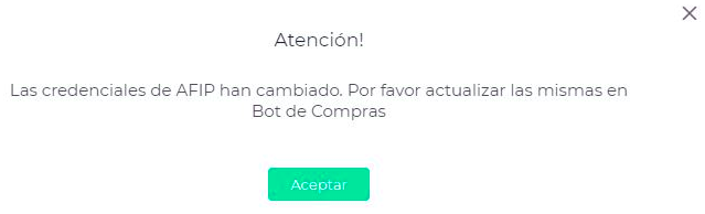 Periódicamente, por seguridad, las credenciales de AFIP se actualizan, por lo que será necesario realizar el cambio del el usuario y contraseña del bot de compras.