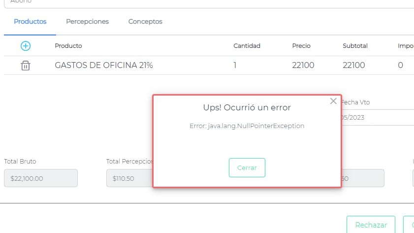 Al querer cargar una factura desde el bot de compras, al momento de guardar, aparece el siguiente mensaje: