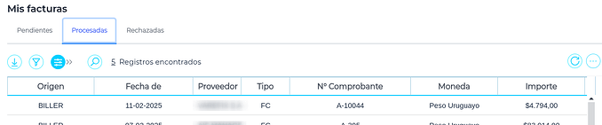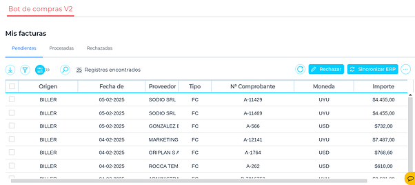 Para poder visualizar las facturas desde el inicio del bot ingresamos a Mis Facturas y lo primero que verán es la solapa de Pendientes con todas aquellas facturas que se encuentren pendientes de contabilizar en el sistema.