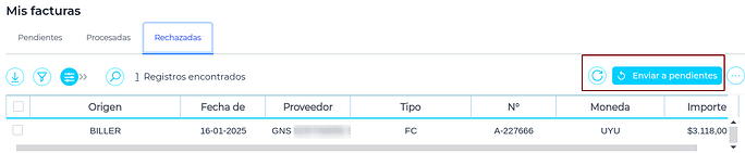 - Enviar una factura rechazada a la pestaña Pendientes, haciendo clic en el botón Enviar a pendientes.