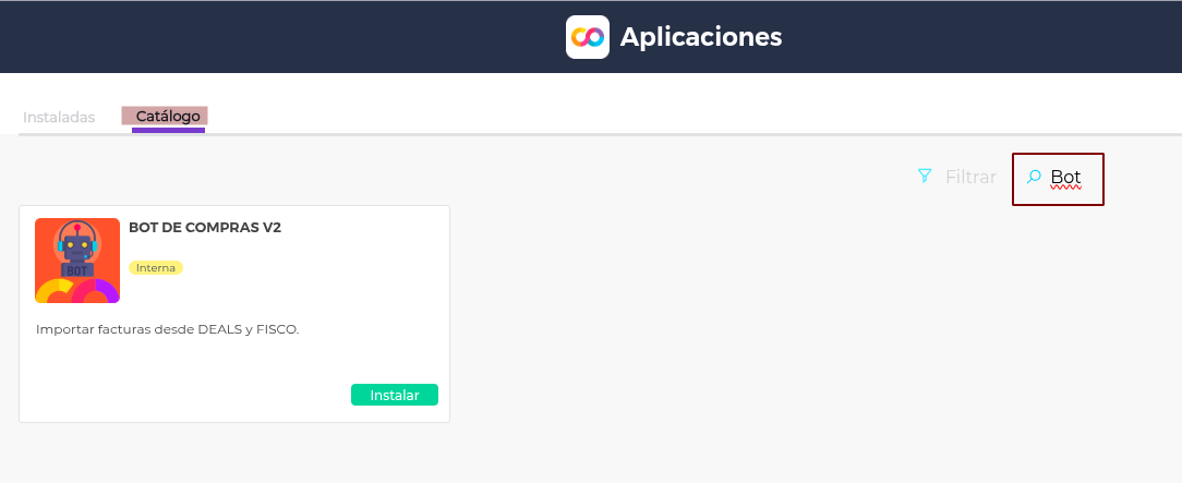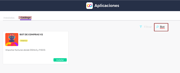 Desde el menú de aplicaciones dirigirse al catálogo y desde la lupa buscar Bot de compras