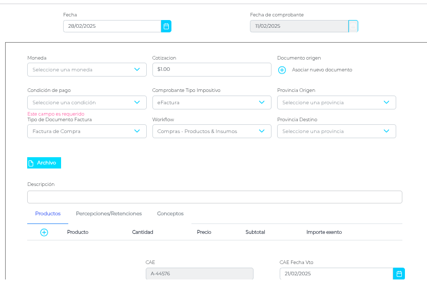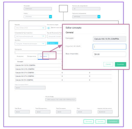 Los impuestos se completan de forma automática en el concepto correspondiente cuando desde el origen se pueda obtener la información.