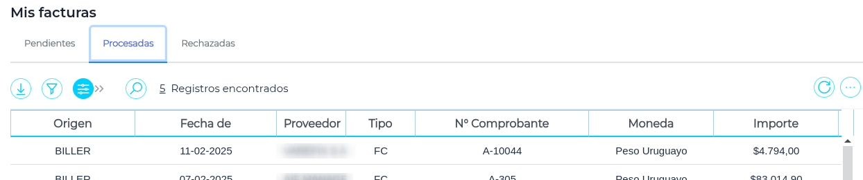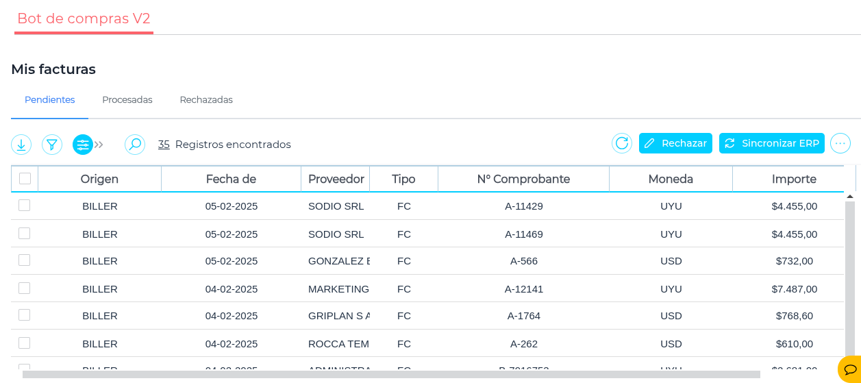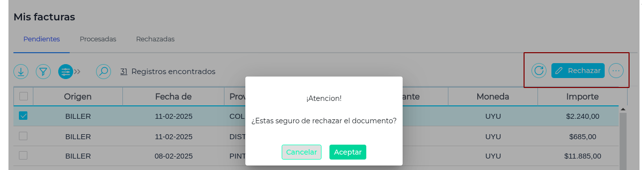 - Rechazar facturas, haciendo clic en el botón Rechazar.