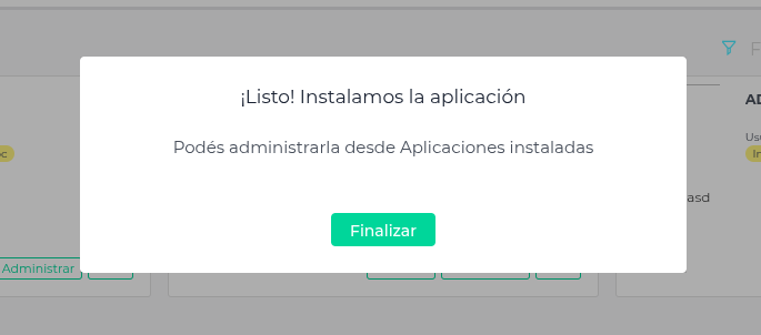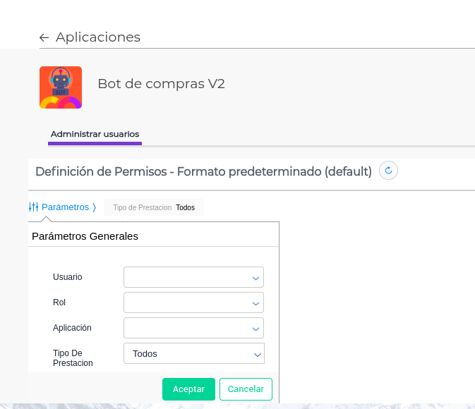 Una vez instalada la aplicación desde la solapa Instaladas del portal de aplicaciones buscar el bot y hacer click en el botón administrar para asignar los usuarios que administrarán el bot.