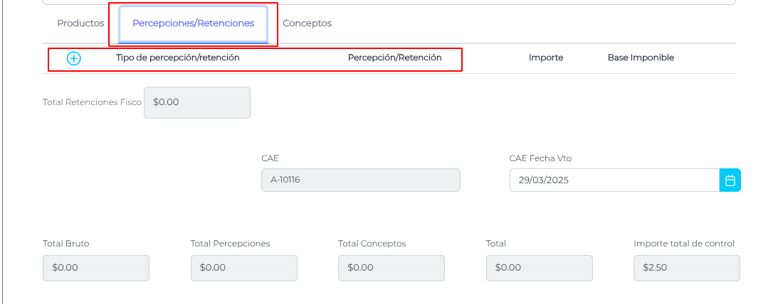 Para registrar una percepción o retención se deberá completar los campos necesarios. Haciendo click en el signo + se abrirá un pop-up solicitando la siguiente información: