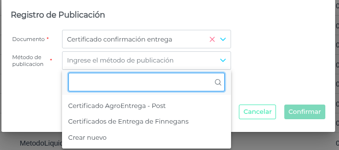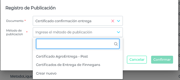- Definir el documento “Certificado confirmación entrega”, método de publicación “Certificado AgroEntrega - Post”.
