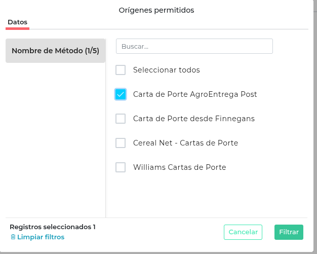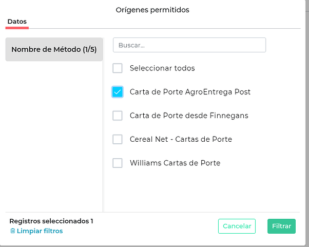 - En la solapa “Orígenes Permitidos”, se debe agregar el procesamiento que se definió anteriormente: seleccionar “Carta de Porte AgroEntrega Post”. El paso siguiente es presionar en el botón “Filtrar”.