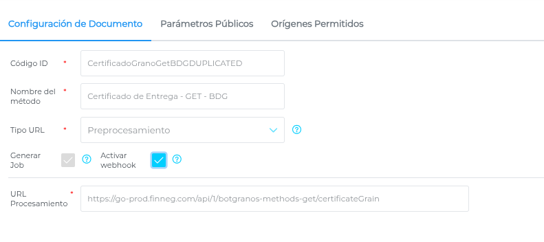- En la solapa “Configuración de Documento” activar el check para la opción “Activar webhook”, el cual habilitará la solapa “Orígenes Permitidos”