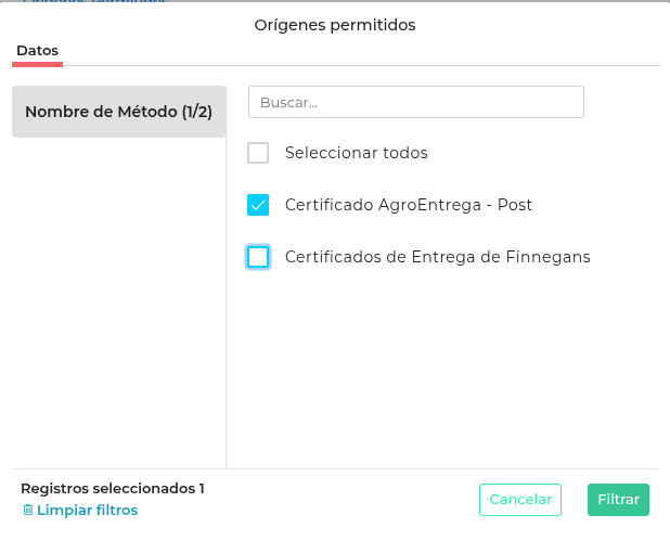 - En la solapa “Orígenes Permitidos”, se debe agregar el procesamiento que se definió anteriormente: seleccionar “Certificado AgroEntrega Post”. El paso siguiente es presionar en el botón “Filtrar”.