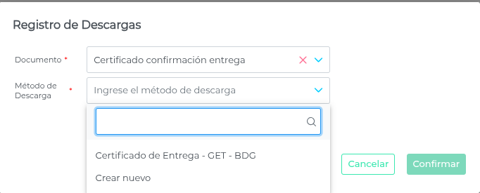 - Definir el documento “Certificado confirmación entrega”, método de descarga “Certificado de Entrega - GET - BDG”.