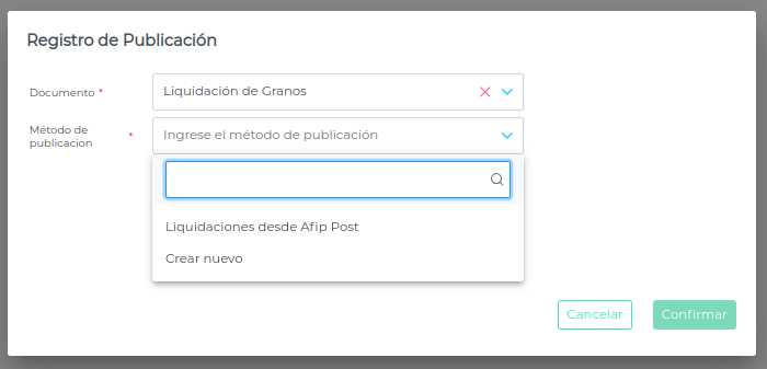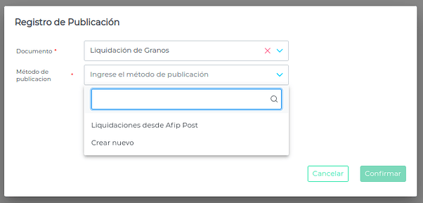 c. Definir el documento “Liquidación de Granos”, método de publicación “Liquidaciones desde Afip Post” y presionar en el botón “Confirmar”